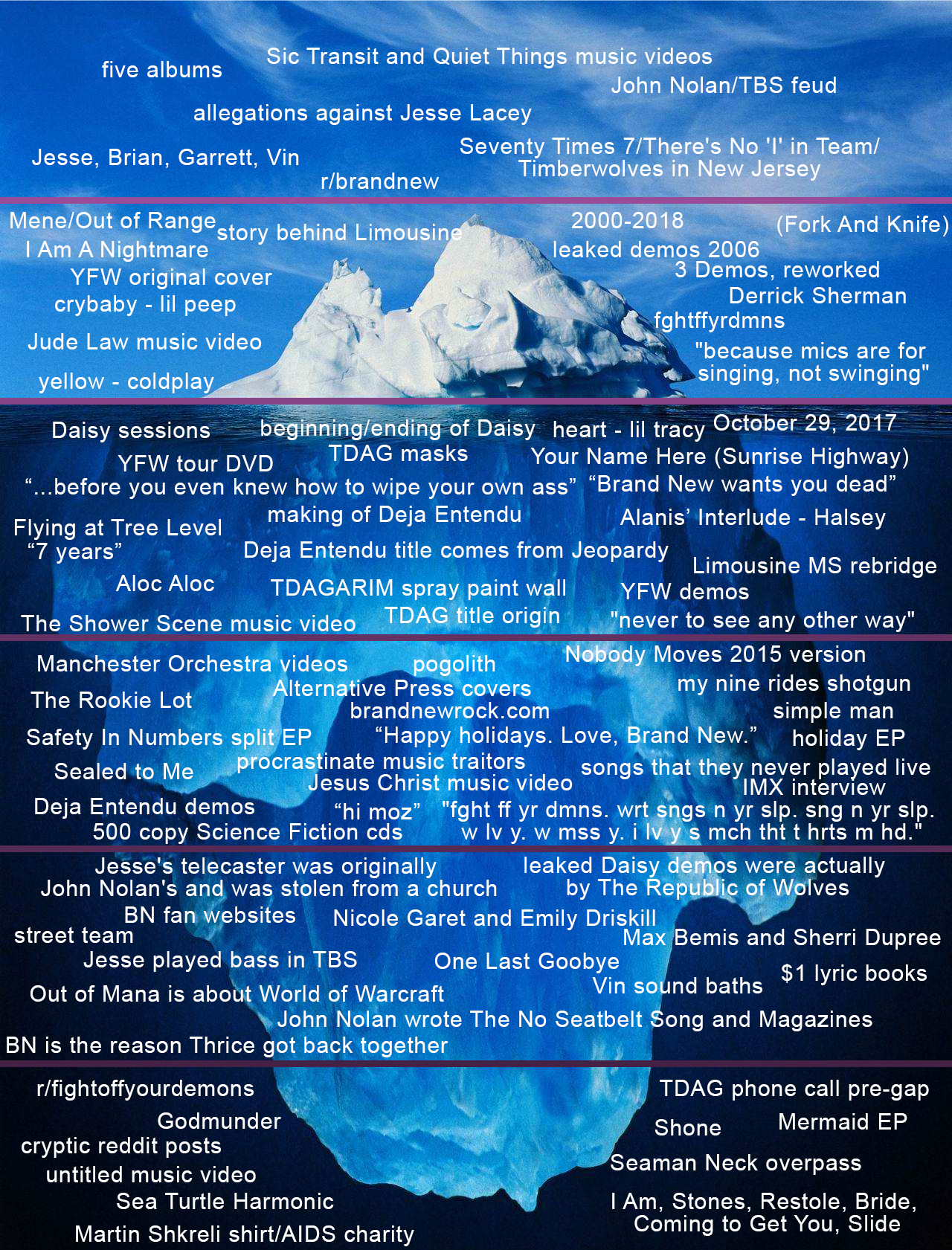 r/fightoffyourdemons: subreddit that some BN fans used after the allegations came out because r/brandnew mods were banning people. Had some normal posts actually talking about the band but quickly devolved into trying to prove that the allegations were false.Godmunder: Jesse and John’s highschool band.